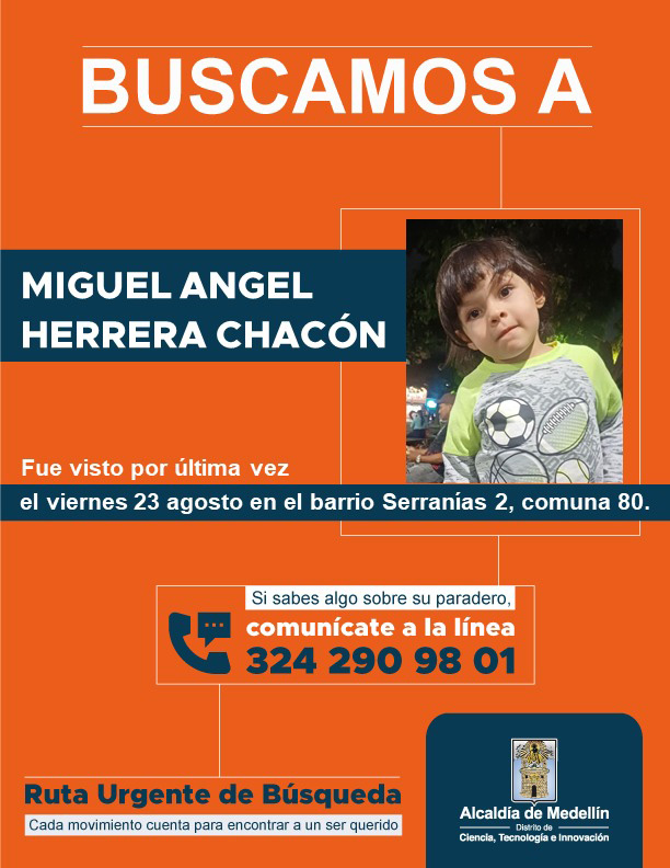 Resumen: Miguel Ángel Herrera Chacón fue visto por última vez el viernes 23 de agosto en el barrio Serranías 2, Comuna 80. Si lo reconoces o sabes algo de su paradero, comunícate a la línea 3242909801.