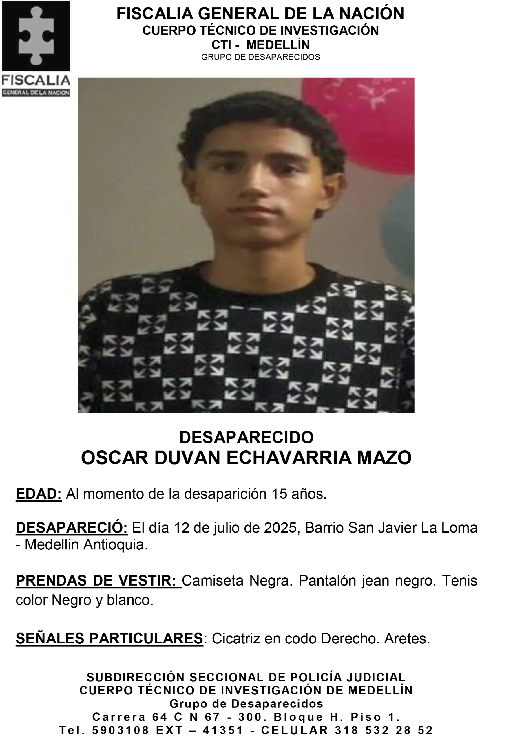 Óscar Duván Echavarría Mazo, un adolescente de 15 años, desapareció el 12 de julio de 2025 en el barrio San Javier La Loma, ubicado en Medellín, Antioquia.