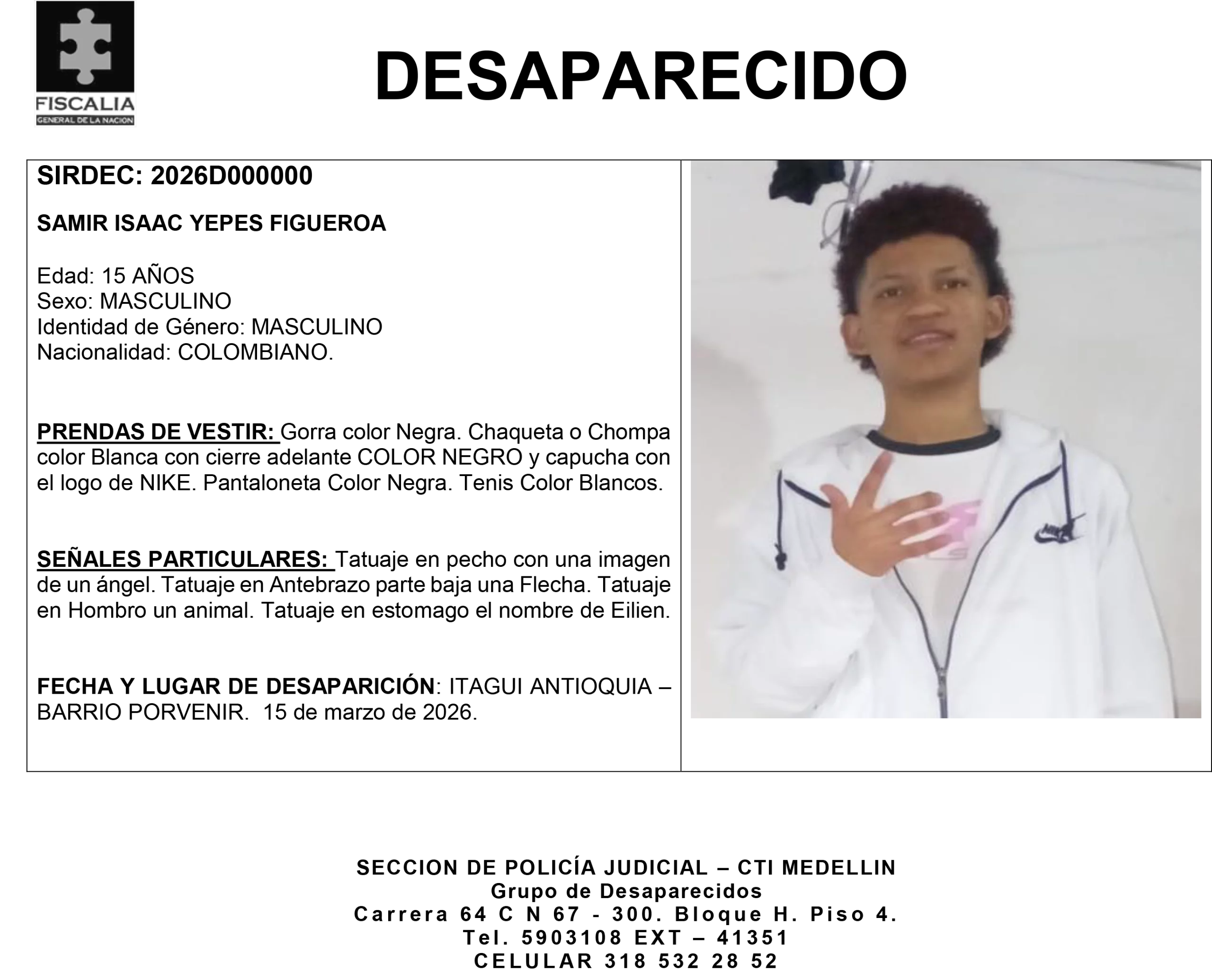 Resumen: Samir Isaac Yepes Figueroa es un adolescente colombiano de 15 años, de sexo masculino e identidad de género masculina. Fue reportado como desaparecido en el barrio Porvenir, en Itagüí, Antioquia, el 15 de marzo de 2026.