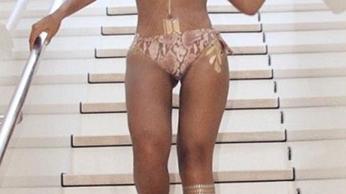 En la nueva foto que ha publicado donde se le puede ver en bikini y que fue agregada a su página web el martes, se le puede ver claramente una de las escaleras detrás de ella no está nivelado.