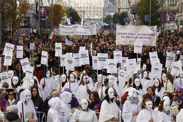 Madrid, 25 nov (EFE).- Miles de personas se manifestaron este sábado en Madrid para pedir el fin de la violencia contra las mujeres y la igualdad, en dos marchas convocadas por distintas organizaciones feministas en momentos diferentes.