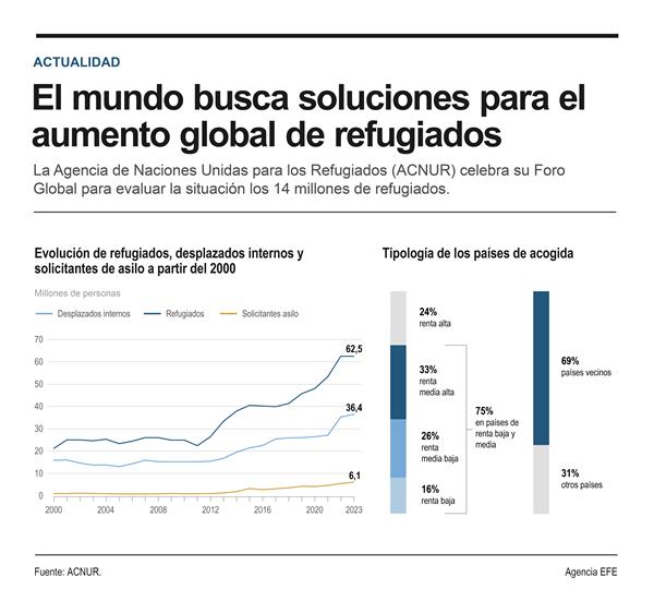 Ginebra, 13 dic (EFE).- El II Foro Global de Refugiados, principal cita mundial para atender los problemas de las personas desplazadas, abrió hoy tres jornadas de debates en Ginebra encaminados a buscar soluciones para los 114 millones de personas, un récord histórico, que han dejado su hogar por conflictos, desastres y otras crisis.