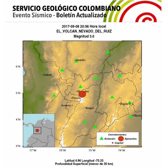 Minuto30.com .- Un sismo de mediana intensidad se registró la noche de este viernes 8 de septiembre. El movimiento telúrico tuvo como epicentro al Nevado del Ruiz. Según reporte oficial de Ingeominas, a las 8:56 de la noche un temblor de magnitud 3 se reportó en los sismógrafos. El evento tuvo una profundidad no mayor […]