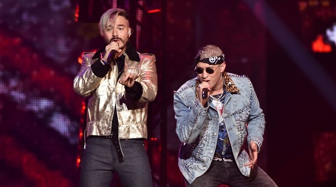 El cantante colombiano J Balvin (i) a duo con Bad Bunny (d)