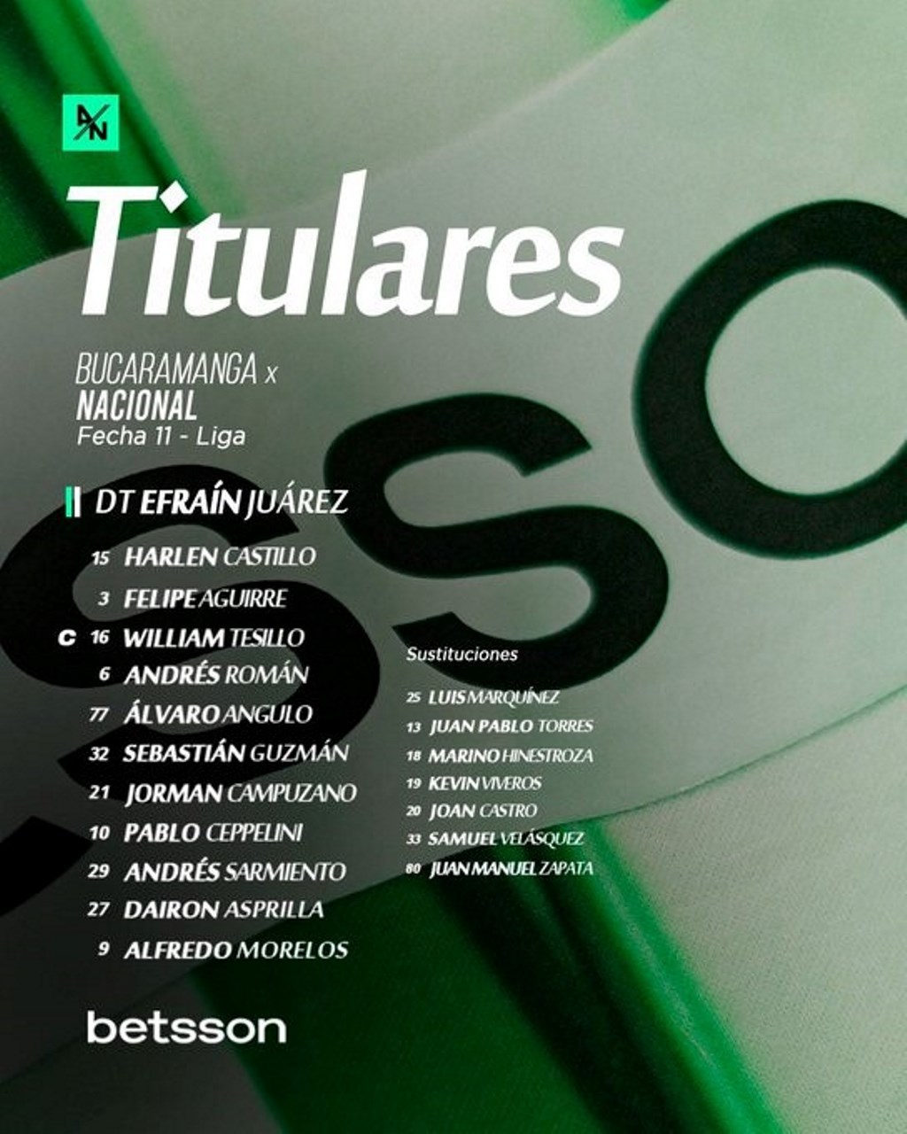Minuto30.com .- Atlético Nacional visita este lunes 23 de septiembre al Bucaramanga por la fecha 11 de la Liga Betplay. Desde las 8:10 de la noche, el balón rodará en el gramado del Estadio Américo Montanini.
