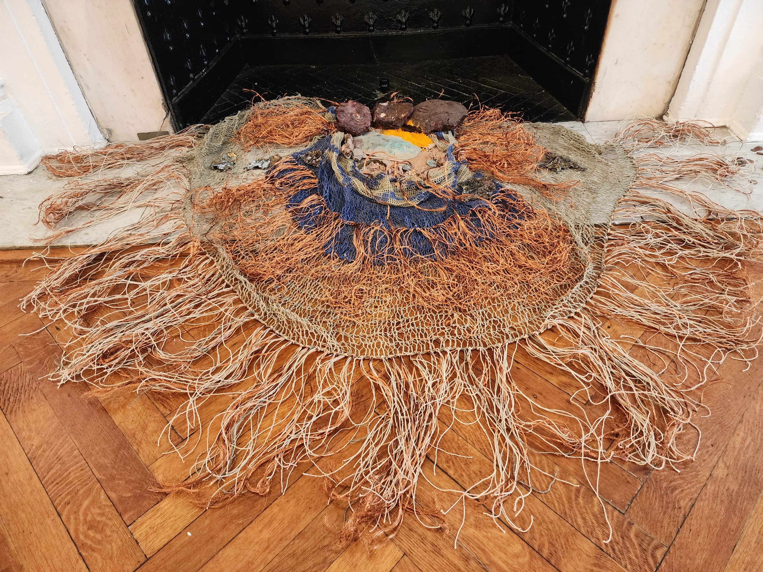 "Trabajo mucho con las comunidades de los Wichis y los Tobar donde son las mujeres las que van al monte y cortan el chaguar, un vegetal con una hoja parecida a la sábila, la que machacan para sacar el agua y queda solo la fibra, de la que luego sacan una especie de hilo", que usa para sus obras, explicó.