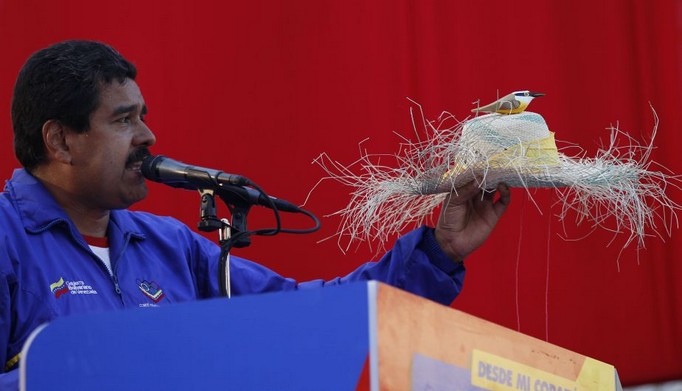 “Miren qué bonito, me lo regaló una compatriota de Nicaragua”, señaló Nicolás Maduro, en referencia a un sombrero de paja con un pajarito encima como reencarnación del fallecido Chávez, durante un mitin en la capital de Venezuela.