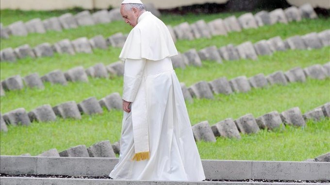 “Sobre la entrada a este cementerio se alza el lema desvergonzado de la guerra: “¿A mí qué me importa?”. Todas estas personas, cuyos restos reposan aquí, tenían sus proyectos, sus sueños… (…) La humanidad dijo: “¿A mí qué me importa?”, recordó.
