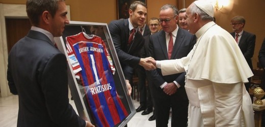 Los capitanes Philipp Lahm y Manuel Neuer y Guardiola entregaron al papa una camiseta del equipo firmada por todos los jugadores.