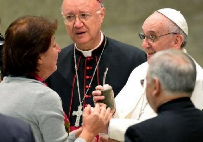 Acarició el perro de un reportero radial italiano ciego, como un San Francisco de nuestros días, y recibió regalos, libros, fotos y hasta un mate. “Pensé ¿qué le puedo llevar?… miré en mi habitación y vi mi mate: es el mate, me dije. Así que lo lavé y hoy se le entregué”, contó Virginia Bonard, compatriota y amiga que viajó desde Buenos Aires para seguir el evento. “Es la bebida de la amistad, hacés una rueda de mate e inicia la charla”, explicó Bonard con la esperanza de que Francisco sea el primer líder de la Iglesia católica adicto al mate.