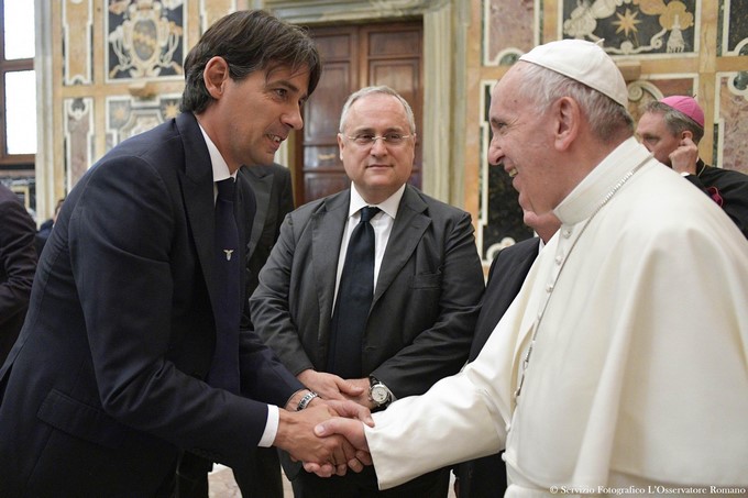 El papa Francisco (d) estrecha la mano del técnico del Lazio, Simone Inzaghi (i)