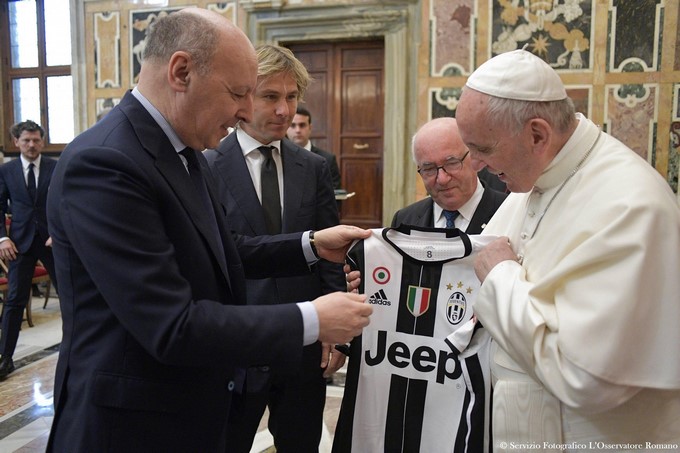 – El papa Francisco (d) recibe una camiseta del Juventus de manos del consejero delegado del equipo, Giuseppe Marotta (i)