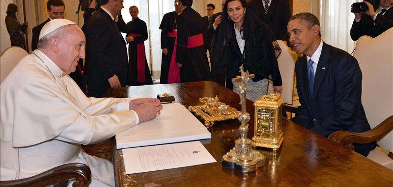 El papa Francisco y el presidente de Estados Unidos, Barack Obama, se reunieron hoy durante 50 minutos, y en total el mandatario estadounidense permaneció en el Vaticano durante dos horas.