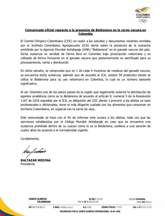 Este es el comunicado del Comité Olímpico Colombiano.