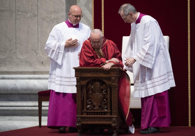 Jorge Bergoglio asistió a la ceremonia vestido con paramentos rojos, sentado en un trono frente a la escultura de San Pedro y en silencio, sin pronunciar ninguna homilía.