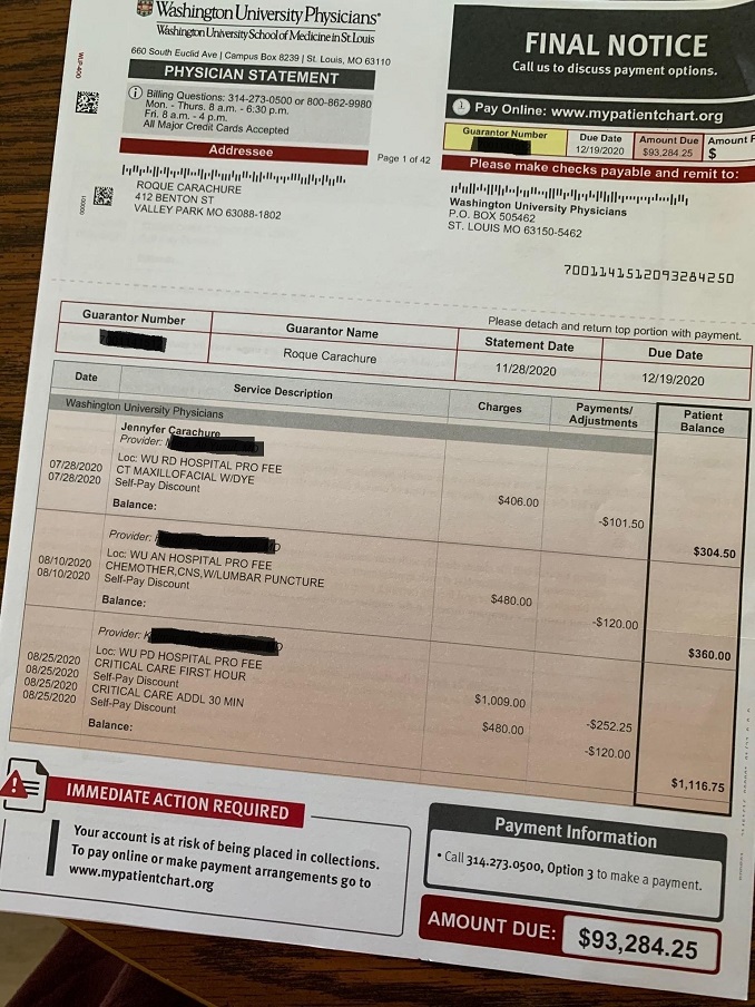 Fotografía familiar cedida donde se muestra la factura “sorpresa” por 93.284 dólares que recibió Roque Carachure de un hospital en San Louis (Missouri) por un tratamiento a su hija Jennyfer, de 11 años, que sufre de cáncer. EFE/Familia Carachure