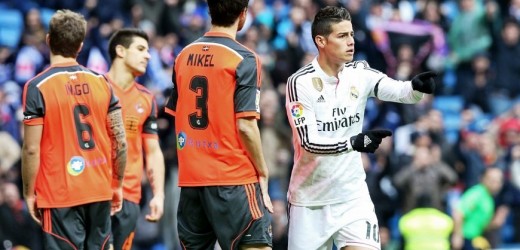 James Rodríguez (d) celebra el gol marcado a la Real Sociedad, durante el partido de la vigésimo primera jornada de Liga de Primera División. EFE