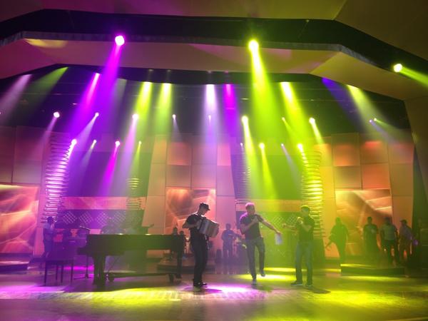 Imagen del ensayo preliminar para el show central de la velada de Elección de la Señorita Colombia. Tomada del twitter de Diego Guarnizo @diegogzo “Vamos a ver como es que es, como se canta y se brinca en un solo pie!”