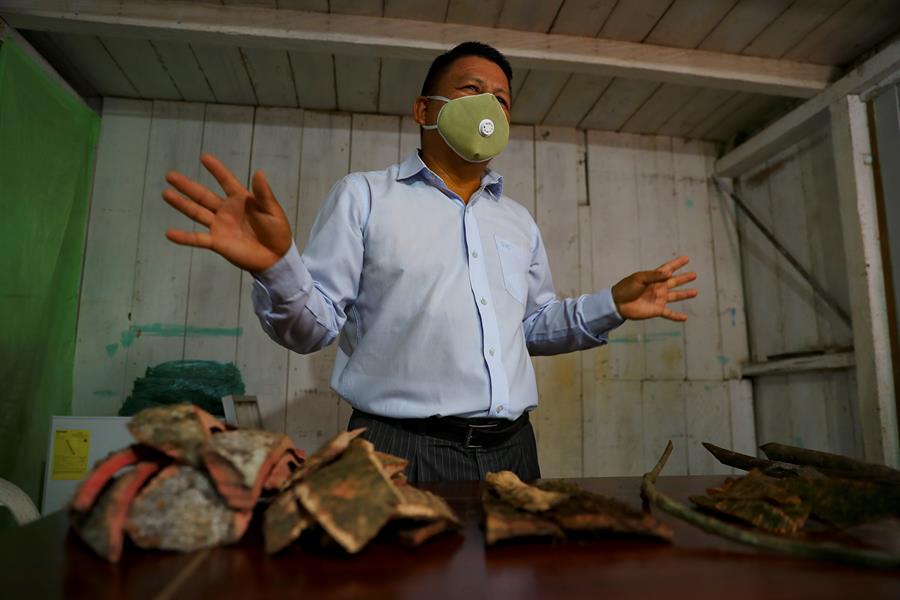 Luciendo un ornamentado “collar del jaguar”, símbolo de su estatus, dice que “hasta ahora solo habían aprovechado lo que les deba la naturaleza” pero que, ante las circunstancias, ha llegado el momento de “sembrar” y “compartir”.
