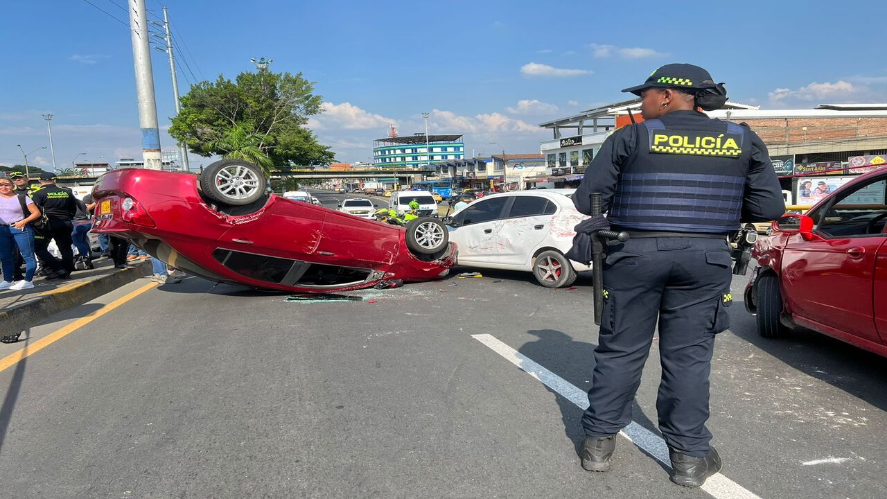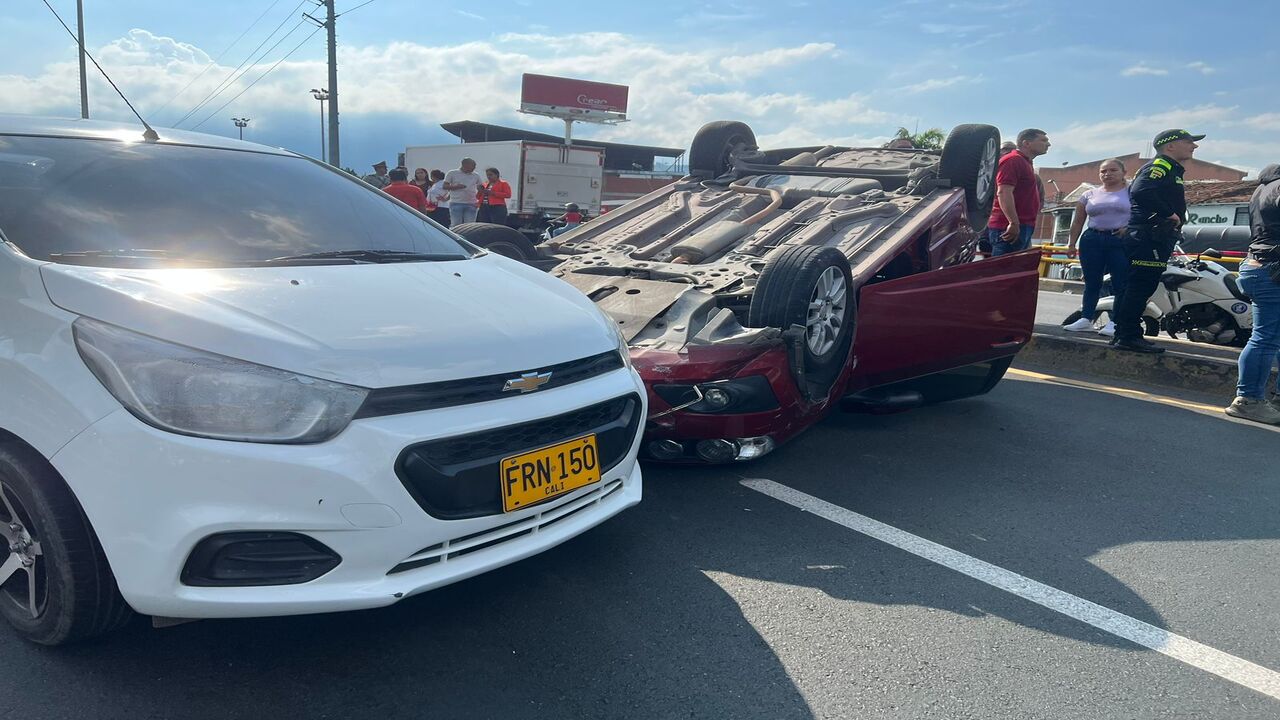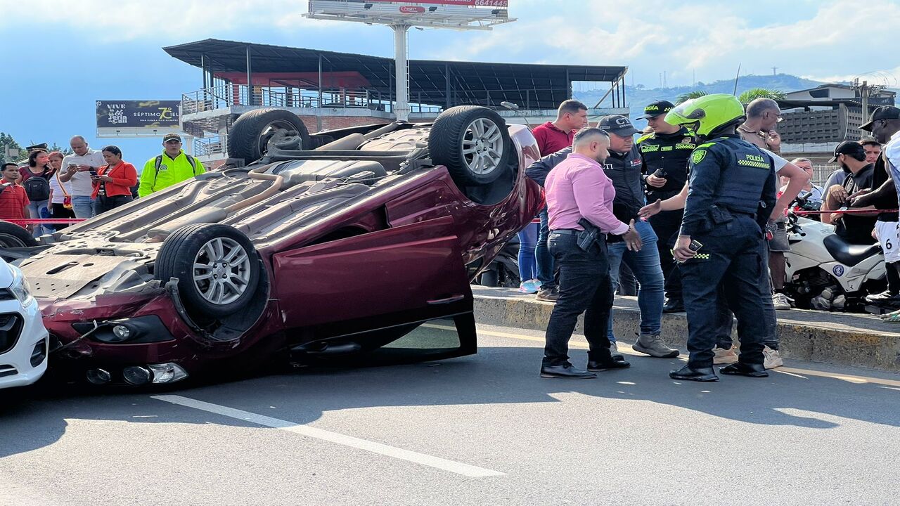 Las patrullas persiguen a los delincuentes, quien al llegar a un trancón se llevaron a vario carros por delante y terminaron volcados.