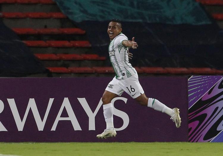 El jugador Vladimir Hernández de Atlético Nacional celebra hoy tras anotar contra River Plate de Uruguay durante un partido por la Copa Sudamericana en el estadio Atanasio Girardot, en Medellín (Colombia). EFE/Luis Eduardo Noriega A