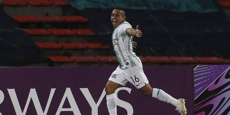 El jugador Vladimir Hernández de Atlético Nacional celebra hoy tras anotar contra River Plate de Uruguay durante un partido por la Copa Sudamericana en el estadio Atanasio Girardot, en Medellín (Colombia). EFE/Luis Eduardo Noriega A