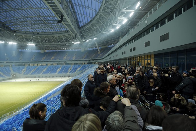 St. Petersburg’s Governor Georgy Poltavchenko (C) speaks with journalists during his visit to the Krestovsky stadium in St. Petersburg, Russia,