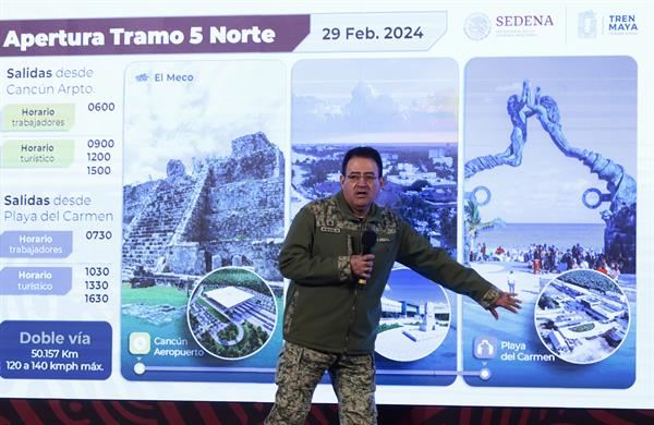 El general Lozano anunció ahora que el 29 de febrero se inaugurará el tramo que recorre Cancún, Puerto Morelos y Playa del Carmen, los principales destinos turísticos del Caribe mexicano.