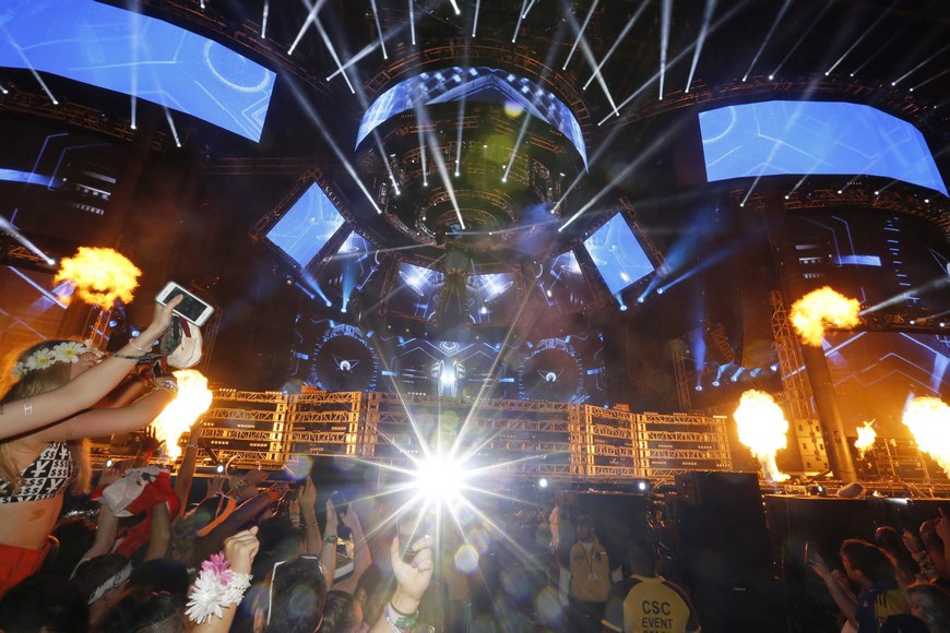 Las intensas vibraciones de los altavoces, incrustados en siete escenarios repartidos por el parque, las luces y pantallas intermitentes, y los colores en el aire producto de los fuegos artificiales fueron otro alimento sensorial del evento, que nació en 1999 en la aledaña urbe de Miami Beach.