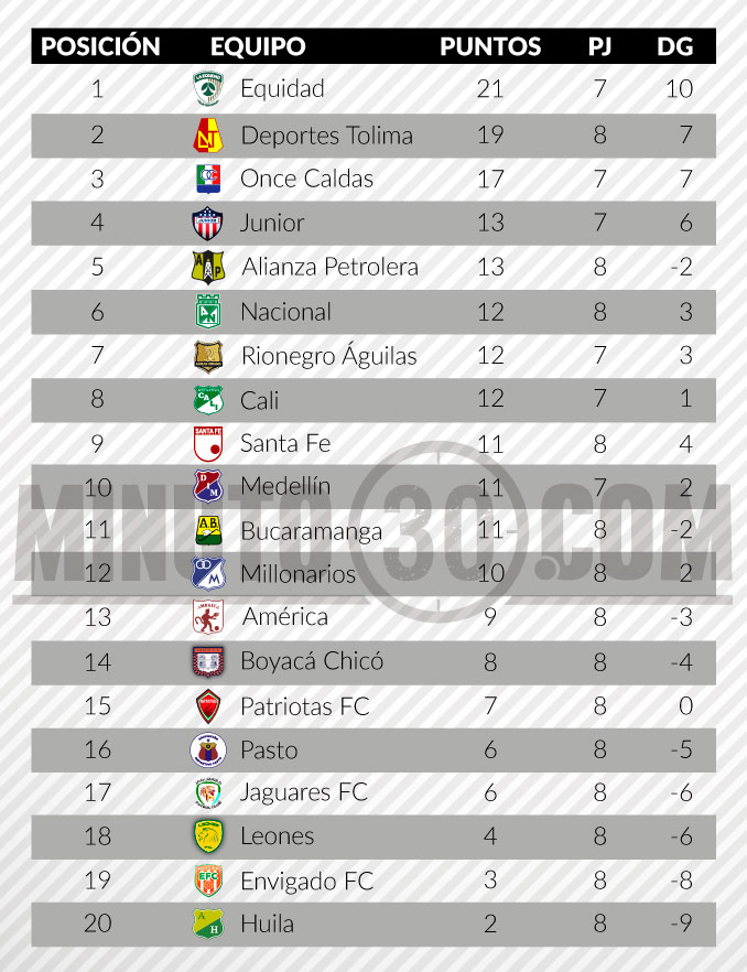 A falta de tres partidos para cerrar la jornada, la tabla de posiciones sigue comandada por La Equidad con 21 puntos y pendiente de su partido ante Independiente Medellín en Bogotá.