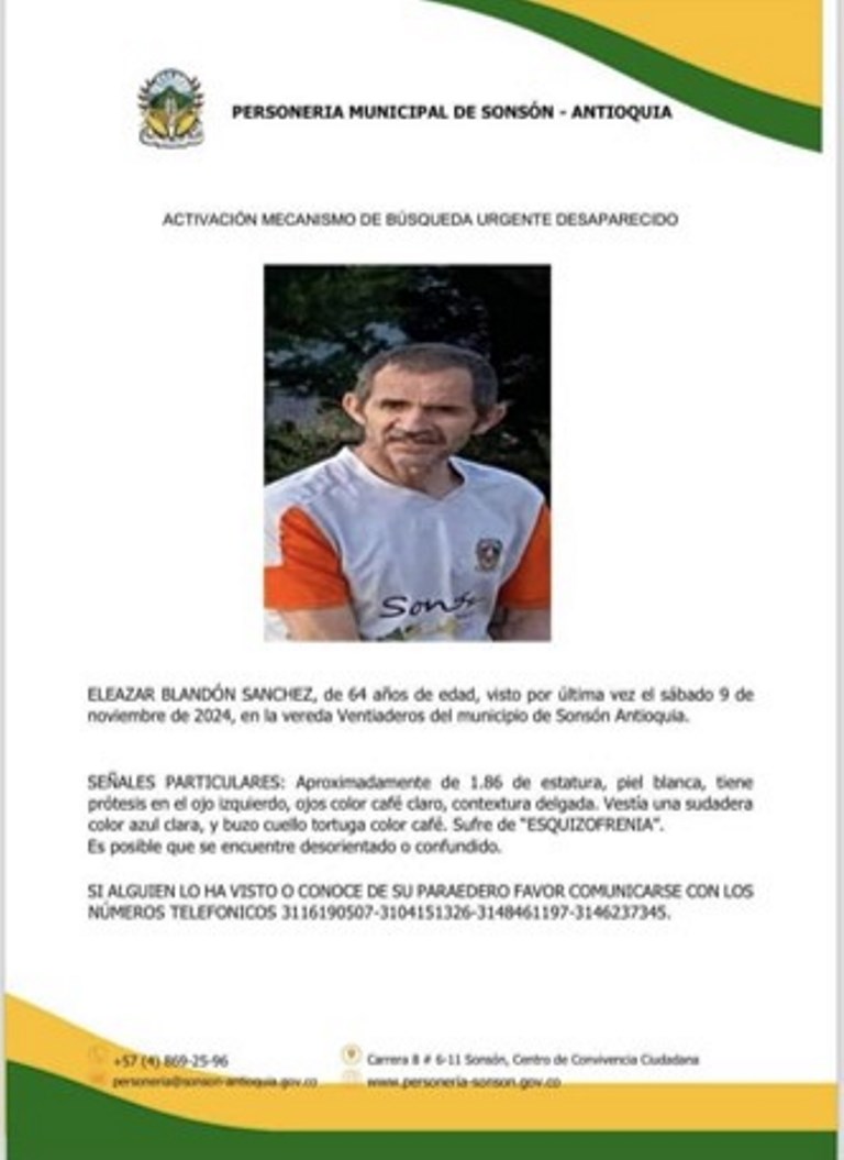 Resumen: Eleazar Blandón Sánchez, desaparecido el 9 de noviembre en la vereda Ventiaderos (Sonsón), padece esquizofrenia y podría estar desorientado. Mide 1,86 m, tiene piel blanca, es delgado y usa prótesis en el ojo izquierdo. Si tiene información sobre su paradero, comuníquese urgentemente.