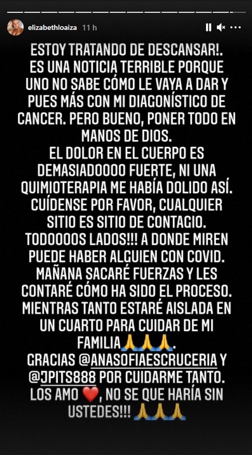 “El dolor en el cuerpo es demasiado fuerte, ni una quimioterapia me había dolido así. Mañana sacaré fuerzas y les contaré cómo ha sido todo el proceso. Mientras tanto estaré aislada en un cuarto para cuidar de mi familia”, escribió en dicha red social.