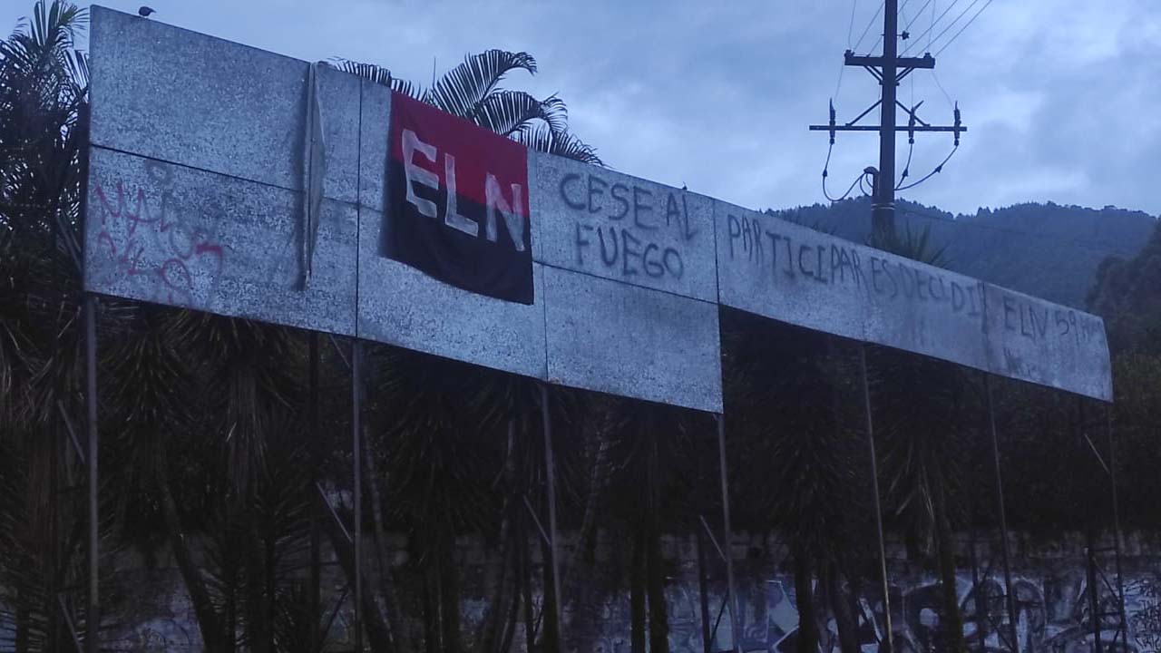 Además, también se puede ver que al lado de esta tela representativa, escribieron: “Cese al fuego, participar es decidir, ELN”.
