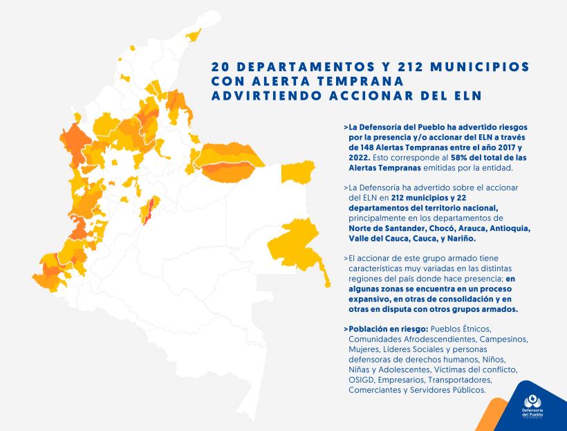 A través de un mapa, la Defensoría del Pueblo representó la presencia del Ejército de Liberación Nacional -ELN- en 22 departamentos de Colombia.