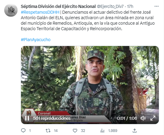 “Rechazo total a estas acciones demenciales. Solidaridad con el Ejército Nacional con la comunidad en Norte de Santander y con el Gobernador. Rechazo también la acción en Remedios, Antioquia. Gracias a Dios no costó la vida ni quedó herido ningún miembro de la Fuerza Pública, del Ejército. Pero las condiciones de esa explosión podían haber tenido también unos efectos devastadores. Entonces rechazo total a estas acciones”, preció el Gobernador.