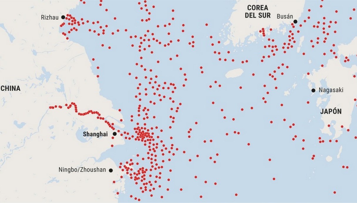 En redes sociales han publicado imágenes satelitales que dejan ver al menos 500 buques a la espera de carga y descarga, detenidos por los bloqueos anticovid de China.