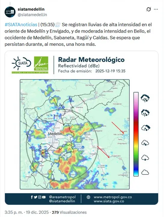 Alta Intensidad: Oriente de Medellín y Envigado. Aquí se registran los mayores acumulados de agua en corto tiempo.