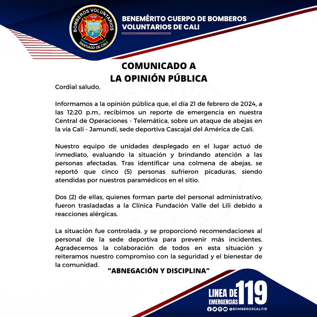 El hecho se registró en la sede del equipo escarlata en Cascajal, desde donde indicó que “tenemos un ataque de abejas africanas. Por favor urgente necesitamos el apoyo de bomberos y ambulancia”.