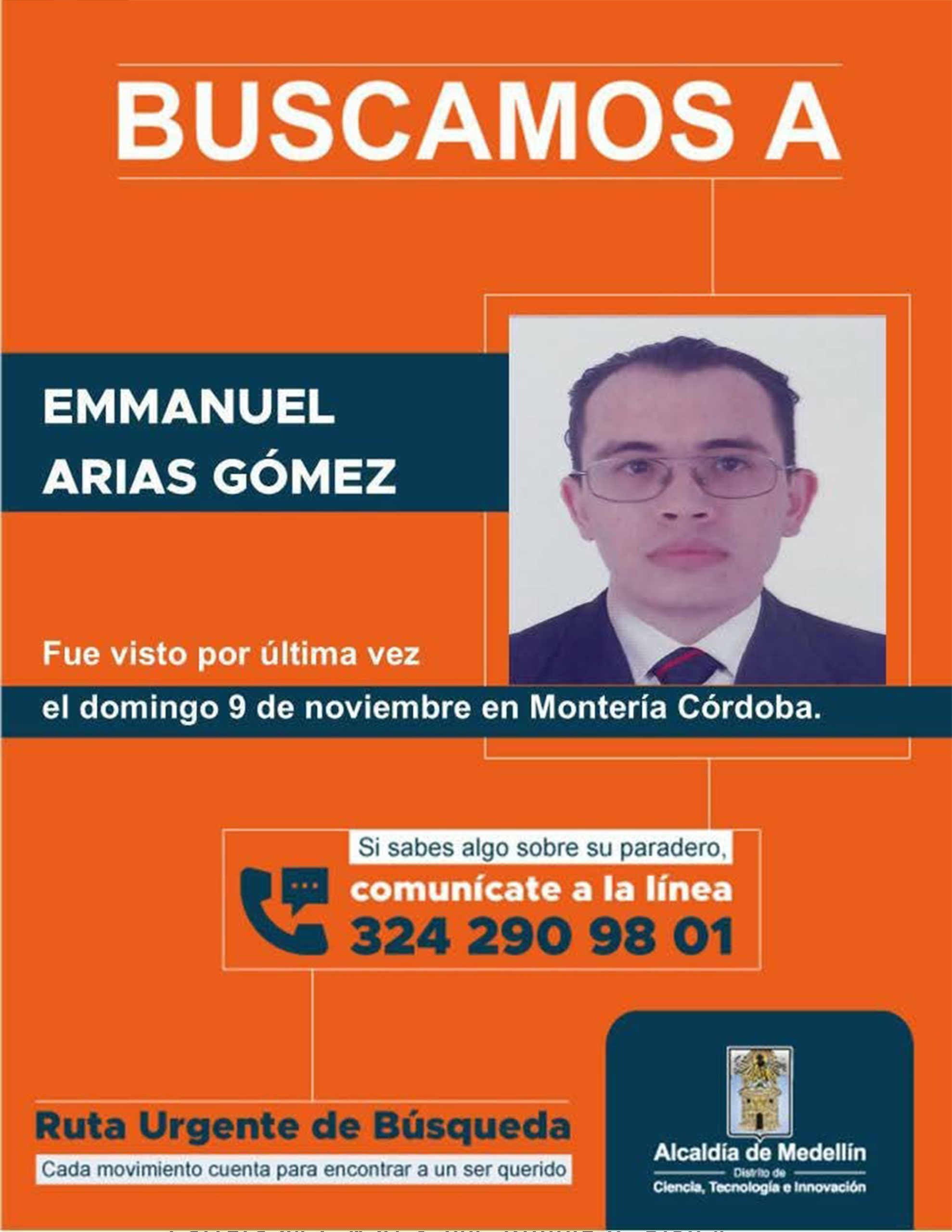 Emmanuel Arias Gómez ha sido reportado como desaparecido. La última vez que se le vio fue el domingo 9 de noviembre en la ciudad de Montería, Córdoba.