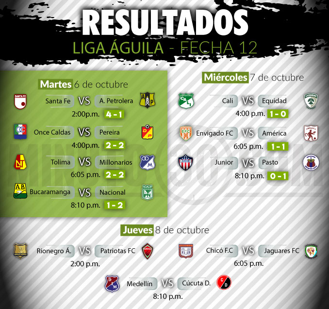 Santa Fe (23 puntos) y Nacional (21), que también ganaron sus respectivos partidos de la fecha 12, están al acecho de los primeros y se ubican tercero y cuarto, respectivamente.