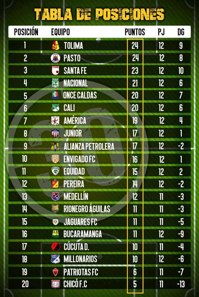 En su orden los siguen, Once Caldas y Deportivo Cali,  con 20 puntos cada uno; América aparece séptimo, con 19; y Atlético Junior, con 17 puntos, cierra el grupo de los ocho, que al menos por esta jornada no tendrá más movimientos.