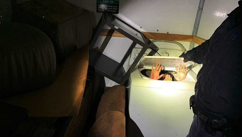 Imágenes tomadas por los agentes de CBP muestran cómo uno de los migrantes estaba escondido en un cofre de madera y otro dentro de una lavadora.