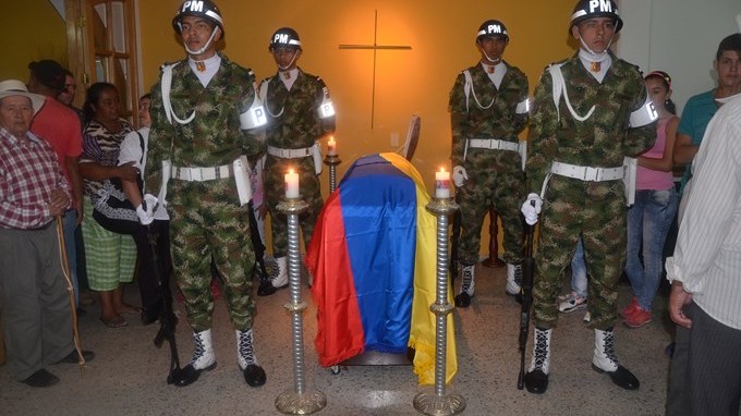 Familiares, amigos, compañeros y autoridades militares le dieron el último adiós al soldado Franklin de Jesús Ospina Cañas, quien llevaba 7 meses en el Ejército, y quien junto a otro compañero, el cabo Tercero Luis Eduardo Rueda Galvis, murió cuando miembros del frente 18 de las Farc ingresaron a la fuerza al consorcio Hidroituango y después de desarmar a uno de los vigilantes dispararon de manera indiscriminada cuando las tropas de la Cuarta Brigada reaccionaron para atender la emergencia.