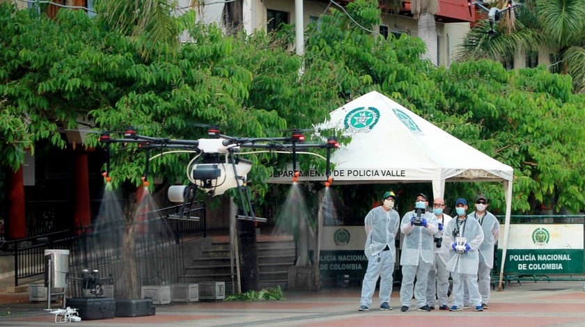 Desde la mañana de este 27 de marzo se hicieron los primeros vuelos con drones para la aspersión de desinfectante en los sitios públicos más concurridos en el municipio de Buga, en el Valle del Cauca.