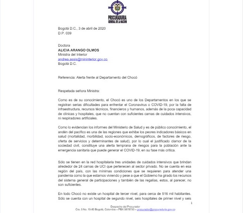 El Procurador General le pidió a la ministra del Interior, Alicia Arango, que ayude a fortalecer y garantice la red hospitalaria departamental en el Chocó, donde hay 24 camas y todas están ocupadas, de acuerdo al ente de control.