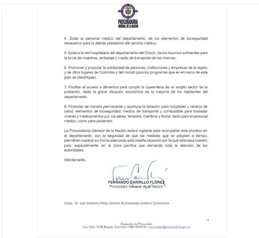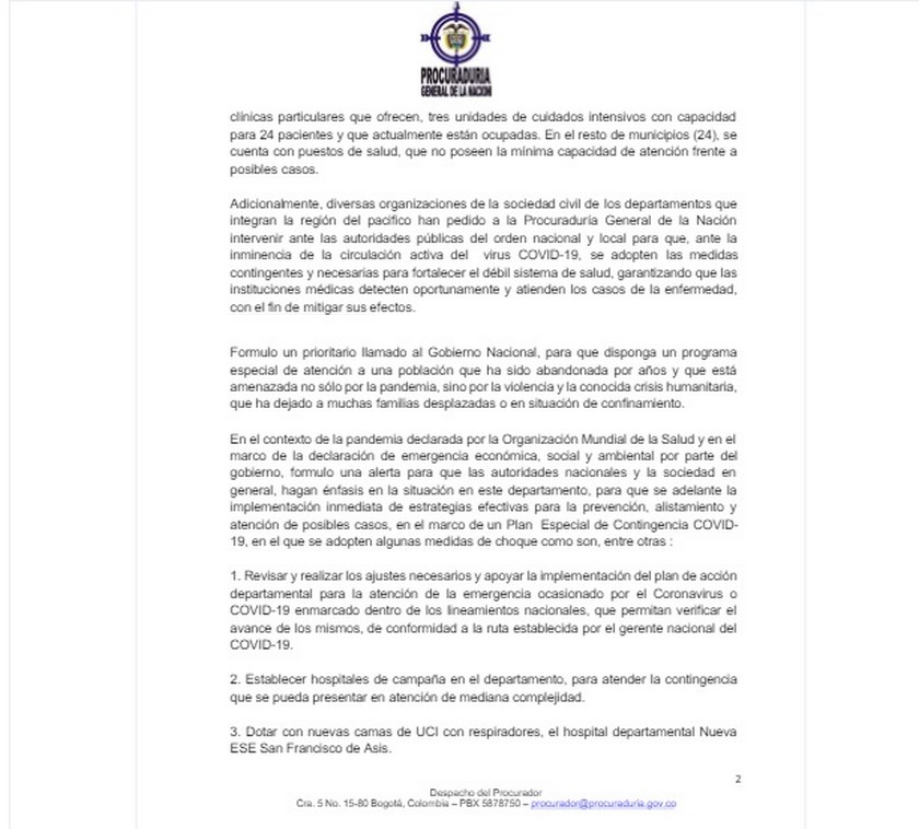 En la misiva, el ente de control anunció que no existe un solo hospital de tercer nivel, solo algunos de segundo y primer nivel, por lo que recalca que el departamento no tendría la capacidad para atender la pandemia que se vive en el país.