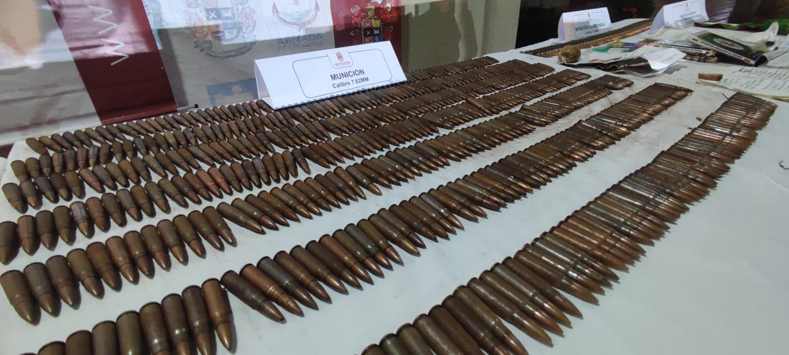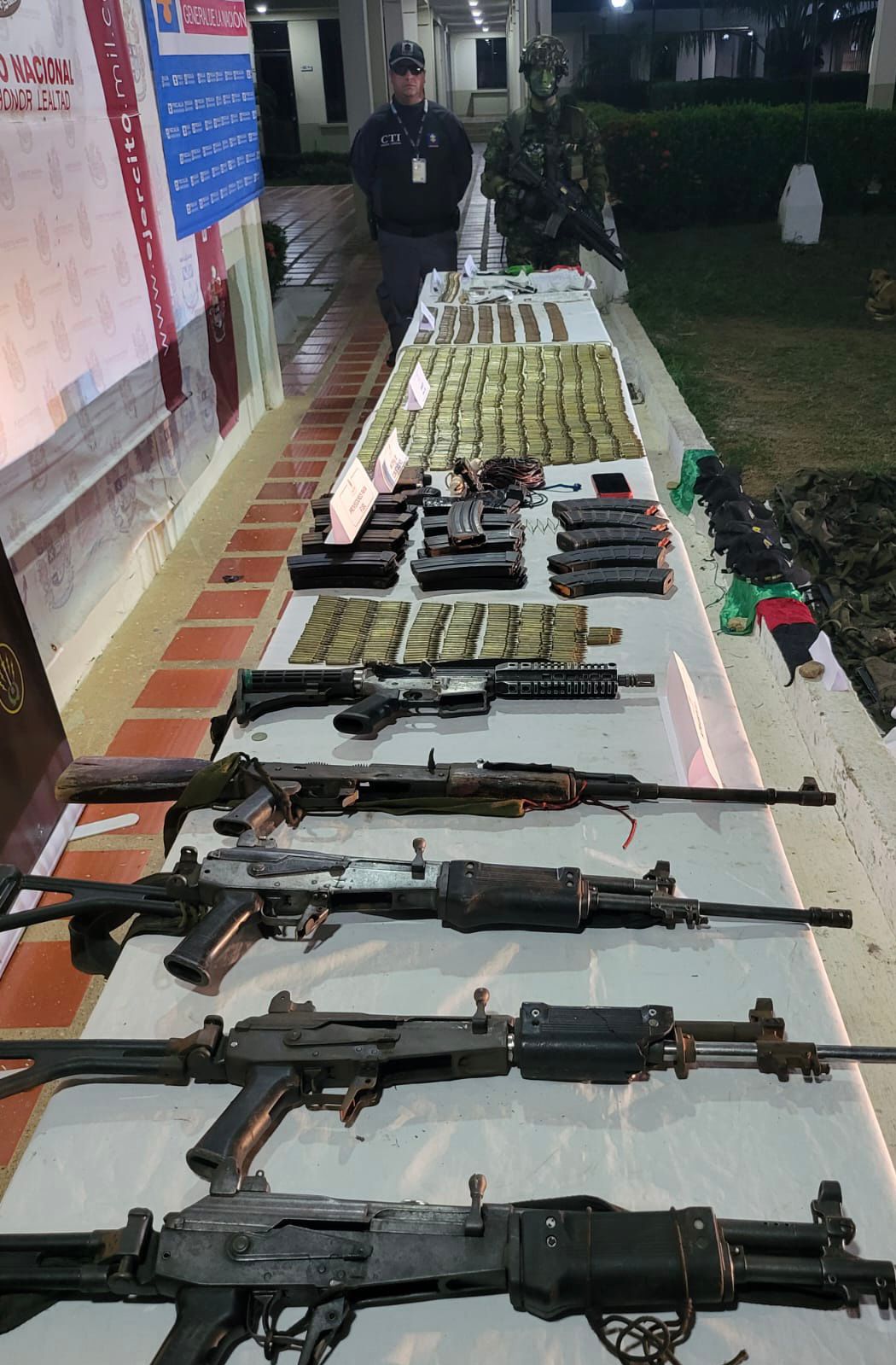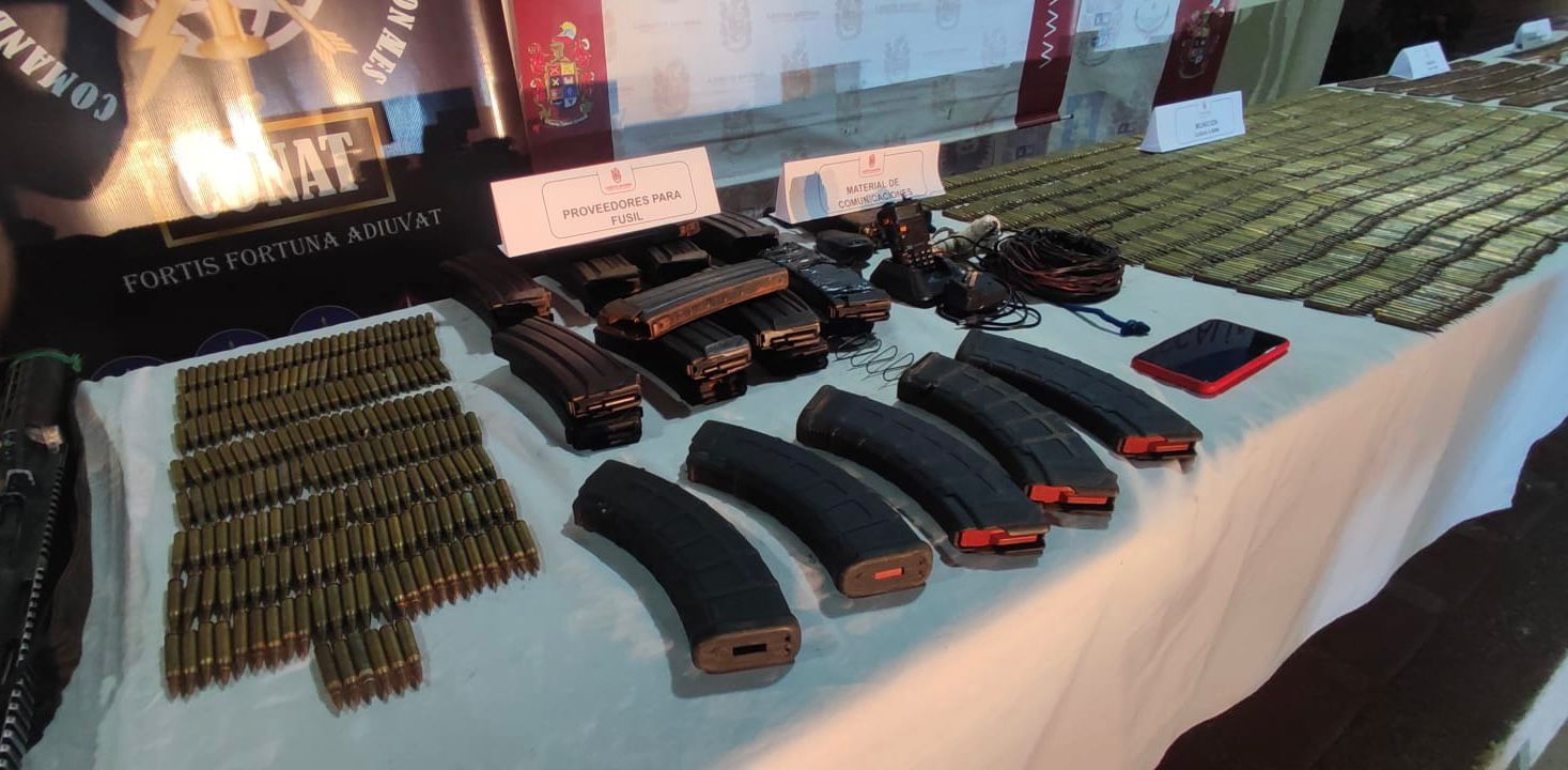 Entre los elementos hallados en el lugar se encontraron cinco fusiles, cerca de 3000 cartuchos de diferentes calibres, más de 20 proveedores, una granada de mano, ocho chalecos multipropósito y dos radios de comunicaciones.