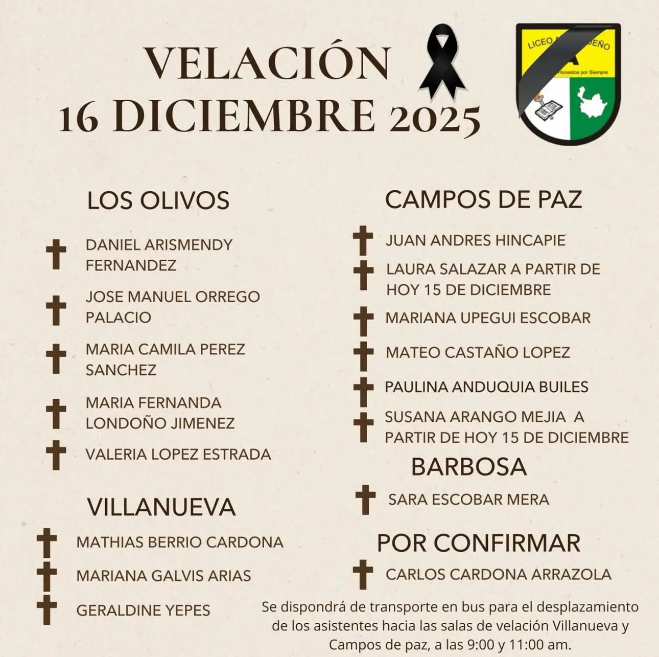 Resumen: Las exequias de los estudiantes del Liceo Antioqueño fallecidos en el accidente se llevan a cabo hoy, 16 de diciembre de 2025, distribuidas en cuatro sedes principales: Los Olivos, Campos de Paz, Villanueva y Barbosa, con un caso aún por confirmar. Para facilitar el acompañamiento de la comunidad, se ha dispuesto transporte en bus hacia las salas de Villanueva y Campos de Paz en horarios de 9:00 a. m. y 11:00 a. m.