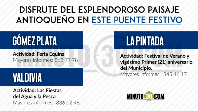 Este puente festivo conocido como el de San José contará con celebraciones especiales en tres municipios antioqueños. Gómez Plata, Valdivia y La Pintada tiene ofertas para que usted se acerque y disfrute de las maravillas de estas localidades. Sin embargo, tiene el departamento atractivos turísticos en todas las suubregiones. SUROESTE: Recorrido por el paisaje y […]