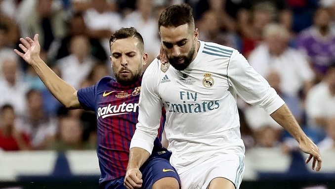 El defensa del Real Madrid Dani Carvajal (d) disputa un balón con el defensa del FC Barcelona Jordi Alba. EFE